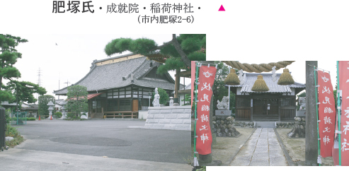 肥塚氏は熊谷氏の始祖・直季の弟。肥塚一帯を治めた。 直実が兵を挙げるとき、その配下として活躍したといわれ る。稲荷神社と成就院一帯が館であったといわれる。村内 に肥塚殿の古碑があるという。室町時代には足利義満に仕 え10代340年も栄える。後に、播州に移る。 |
