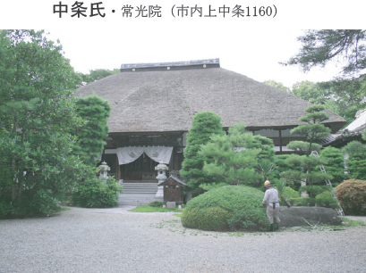 ![]() 中条常光はその昔、京の都からつかわされた役人だ ったが、中条に土着。その孫・家長は頼朝挙兵ですぐ に石橋山に参戦。一の谷や壇ノ浦でも手柄を立てる。 頼朝亡き後も頼家や実朝にも仕えた。「貞永式目」の 作成メンバーとして評定衆に加わる。家長は祖父の追 善供養のために屋敷の一画に寺院を建立した。それが 常光院である。 |