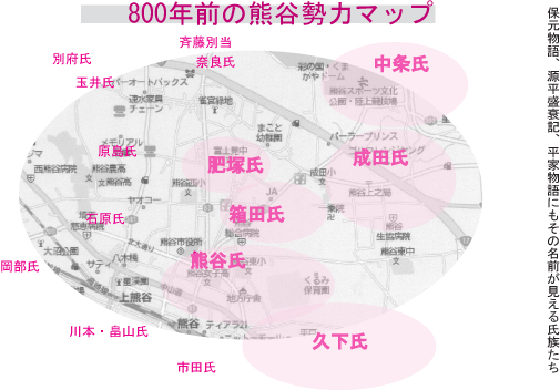 私たちが暮らす熊谷の地、直実さんが生きた時代から、はるかな歳月が流れていますが、 まだその地名に平安末期から鎌倉の匂いを感じることができます。その末裔の方はほとん ど市内にはおられません。身近なお寺や神社の履歴の中に記録を残すだけとなりました。 ところで源平時代、武蔵武士として活躍したのは熊谷直実さんだけではなかったのです。 特に有力だったのは、直実の叔父・久下直光(東竹院・写真@)。鎌倉幕府の要となる 「貞永式目」の作成メンバーで、評定衆の一人・中条家長(常光院・写真D)。後に、行 田の忍城の城主となった成田氏(龍淵寺・写真C)。その成田氏の一族から別れた箱田氏 (箱田神社・写真B)。直実の配下で活躍した親族の肥塚氏(肥塚稲荷神社・写真A)。 この他にも同じく親族の市田氏(大里)、成田氏から別れる奈良氏、玉井氏、別府氏な どがいました。また、石原氏、原島氏もこの時代に活躍した武士団でした。近在では川本 の畠山氏、岡部の岡部氏、妻沼の斉藤別当実盛もいます。この実盛公は直実より30才も年 長でその武勇と品格は群をぬいていたようです。又、畠山重忠公と中条家長公は直実より も24才位年下ですが、その力量は鎌倉幕府にあってもエリート的存在でした。熊谷という 町にはかつてこんなに元気な武将たちが暮らしていたのです。 | ||